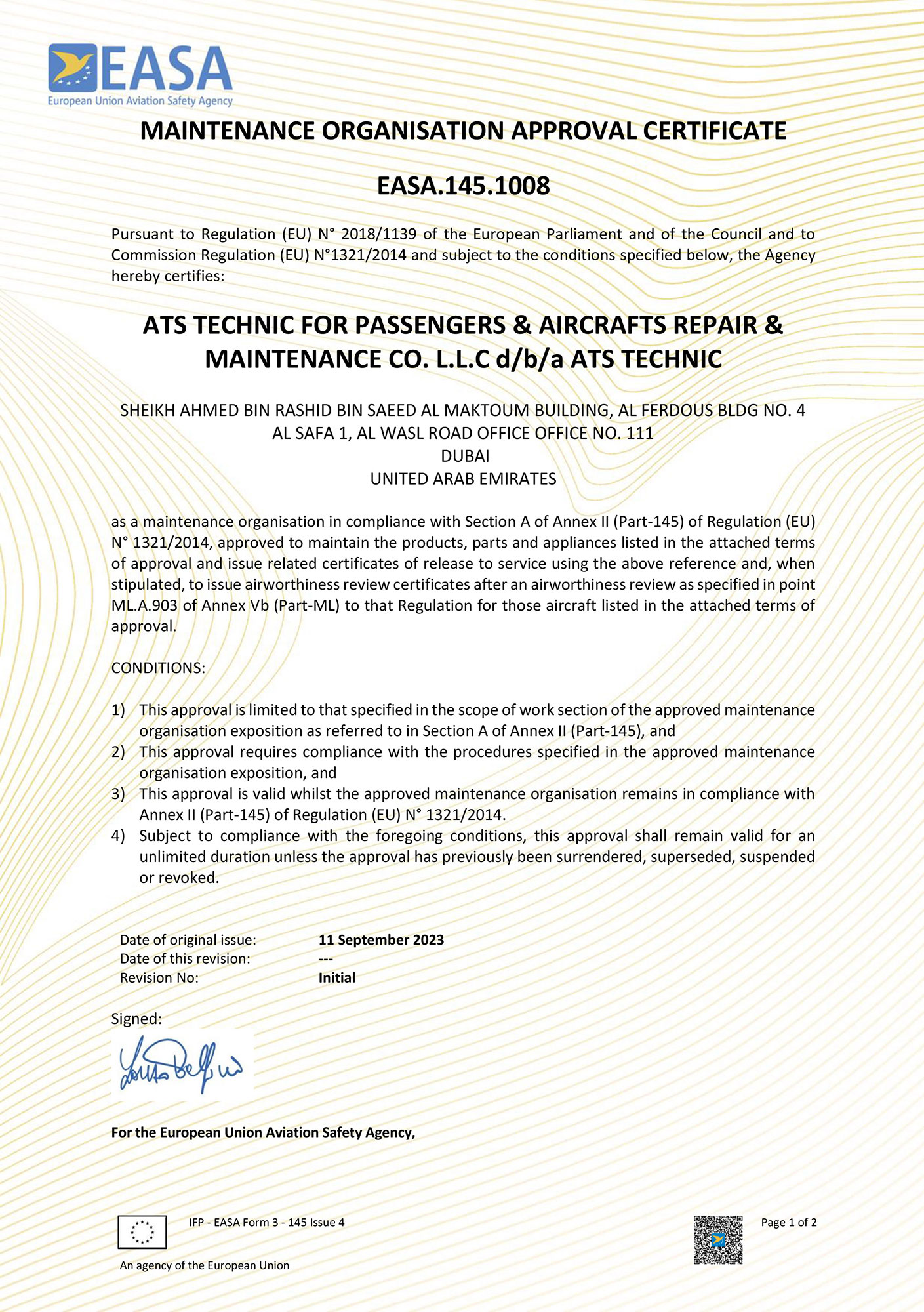 ATS Technic has been granted EASA approval 145.1008 as the first independent EASA Maintenance Organization in UAE.